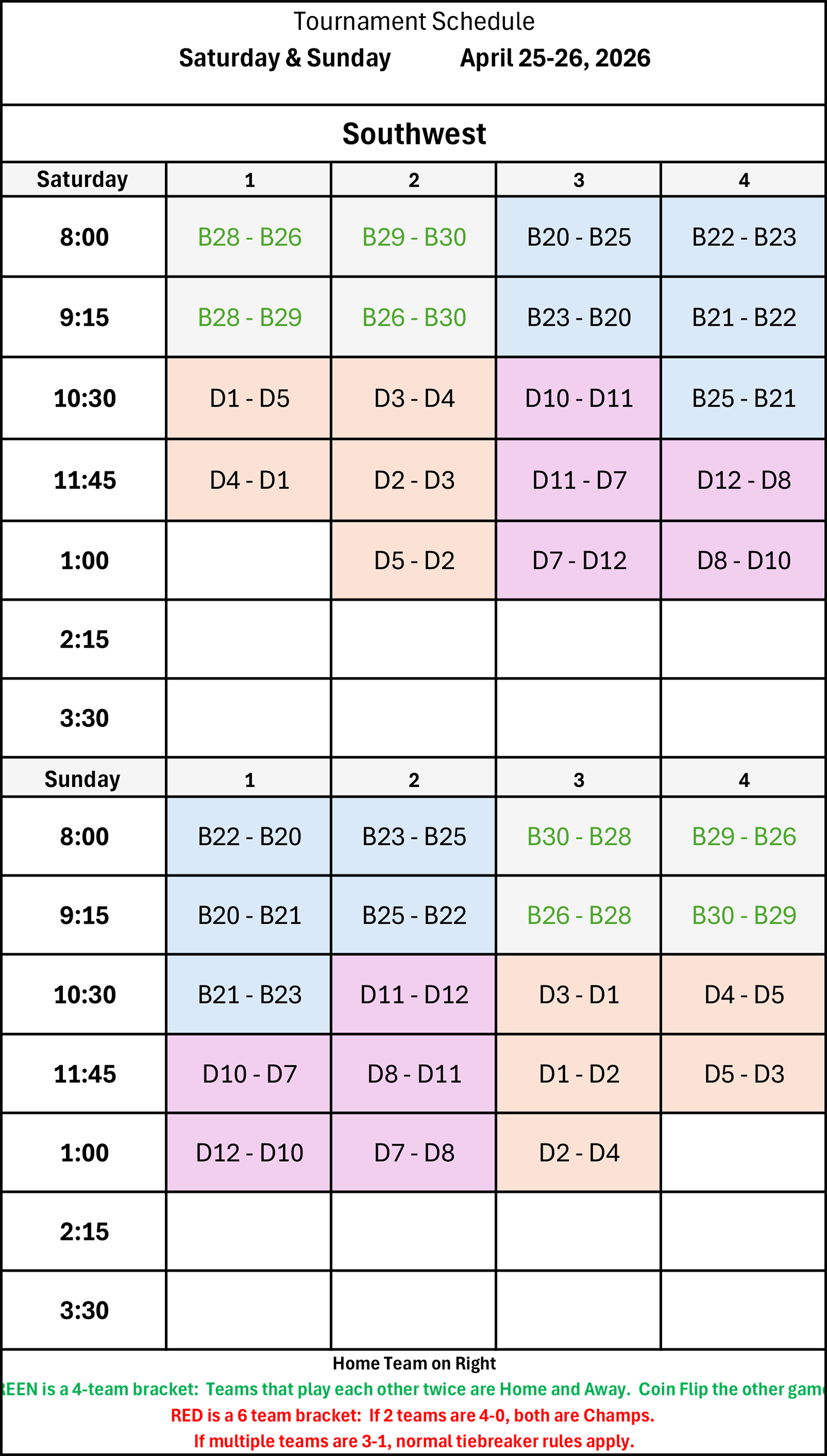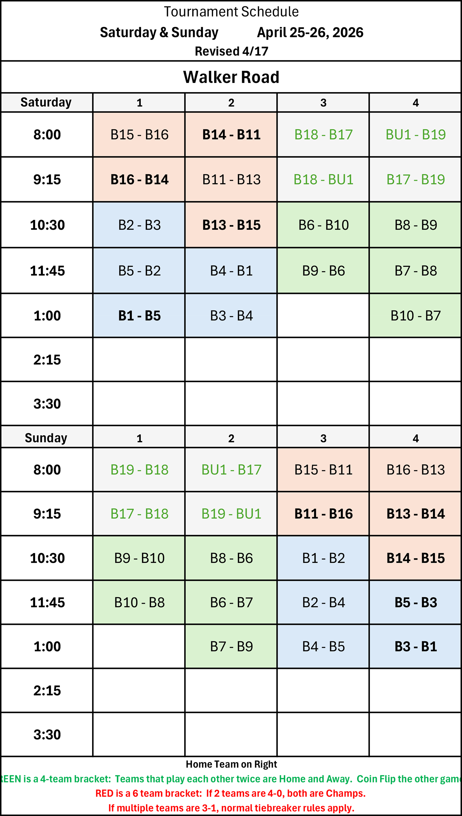 | 8:00 | B11 - B13 | B16 - B14 | B9 - B10 | B6 - B7 |