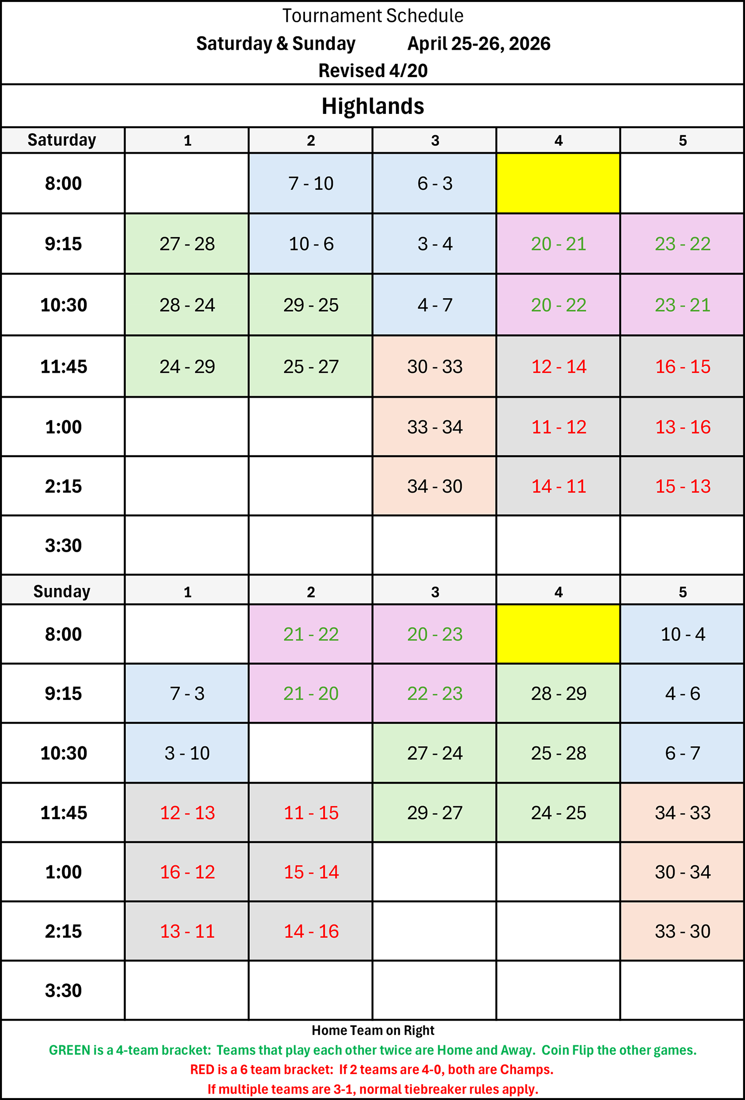 | 9:15 | 28 - 24 | 29 - 25 | 23 - 20 | 22 - 21 | 33 - 30 |