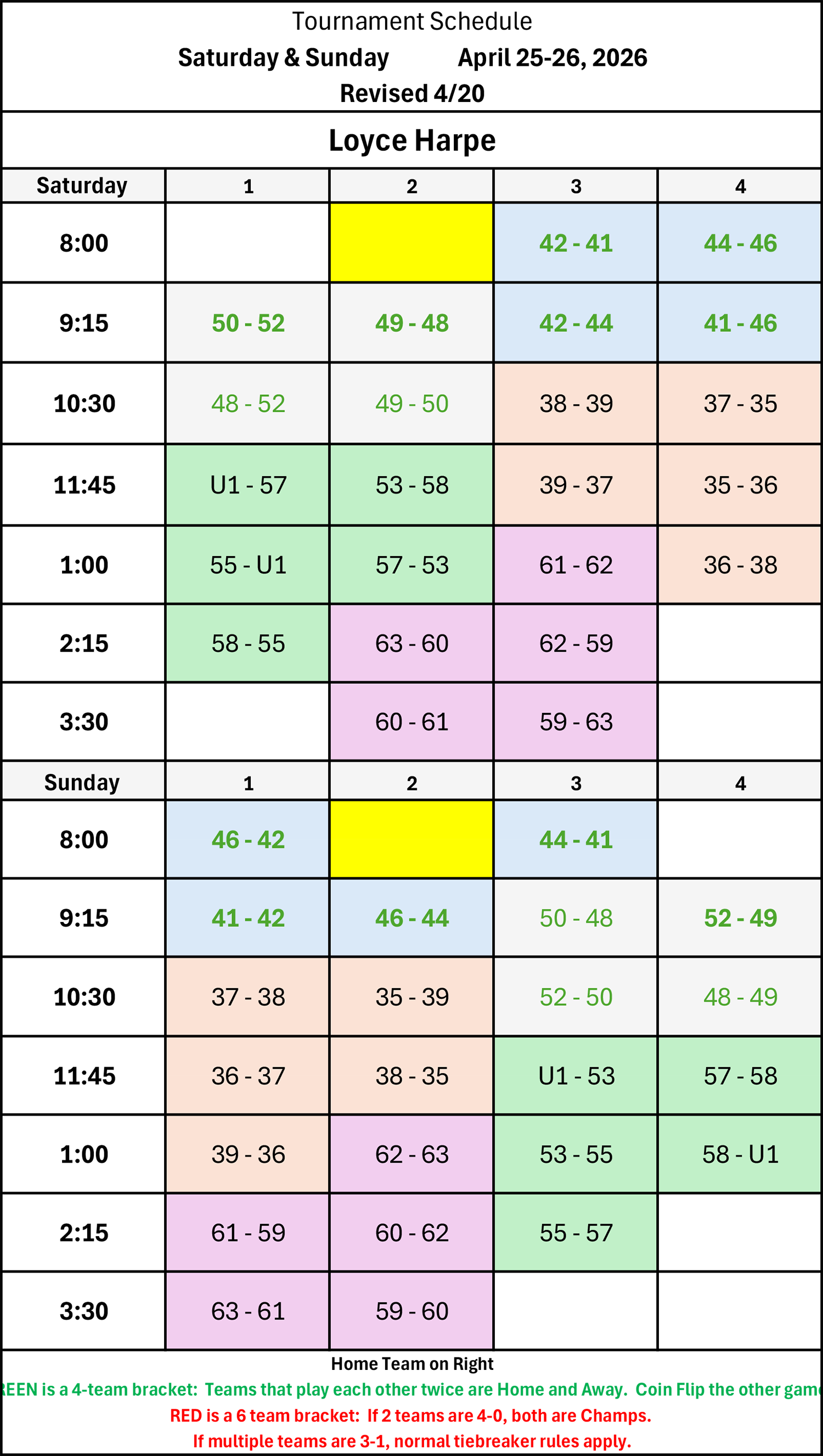 | 9:15 | U1 - 53 | 55 - 57 | 37 - 35 | 36 - 38 |