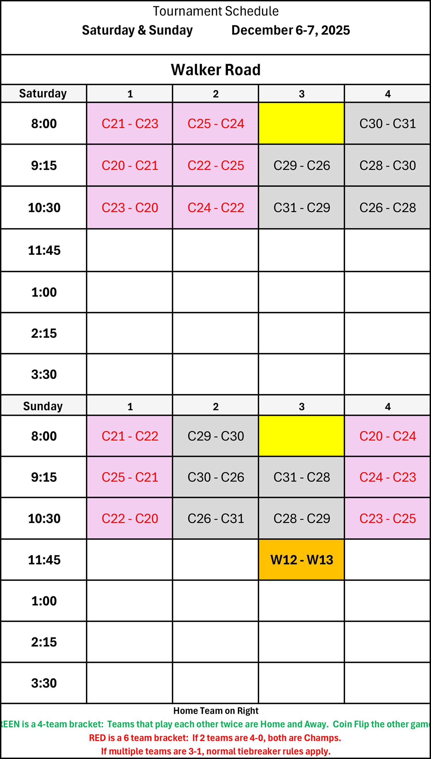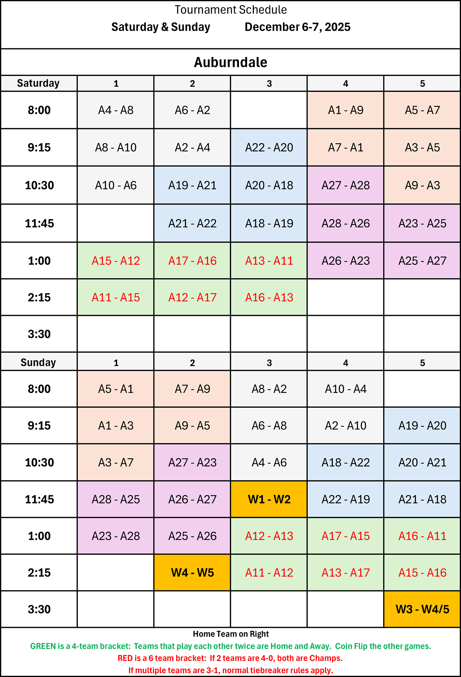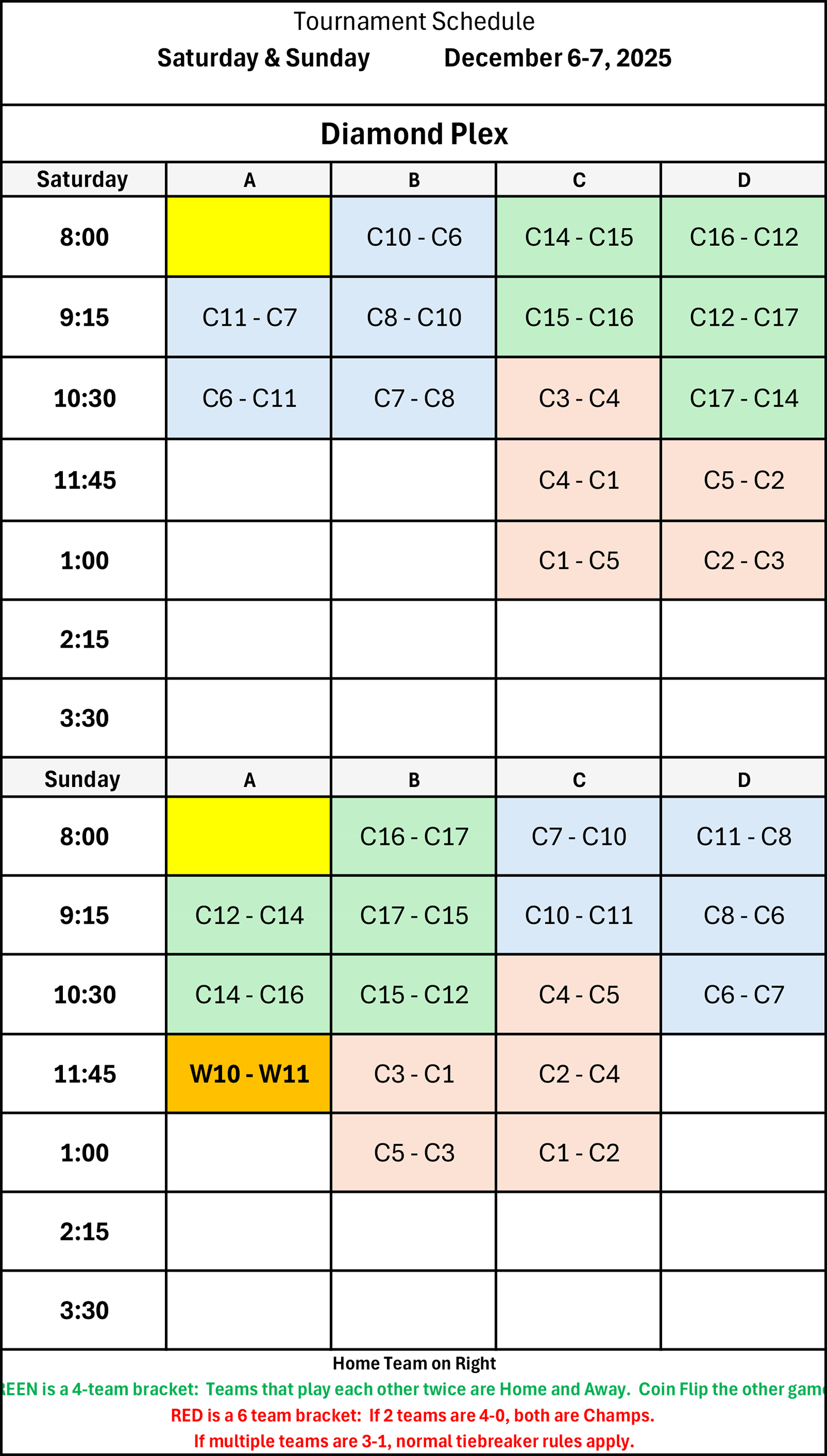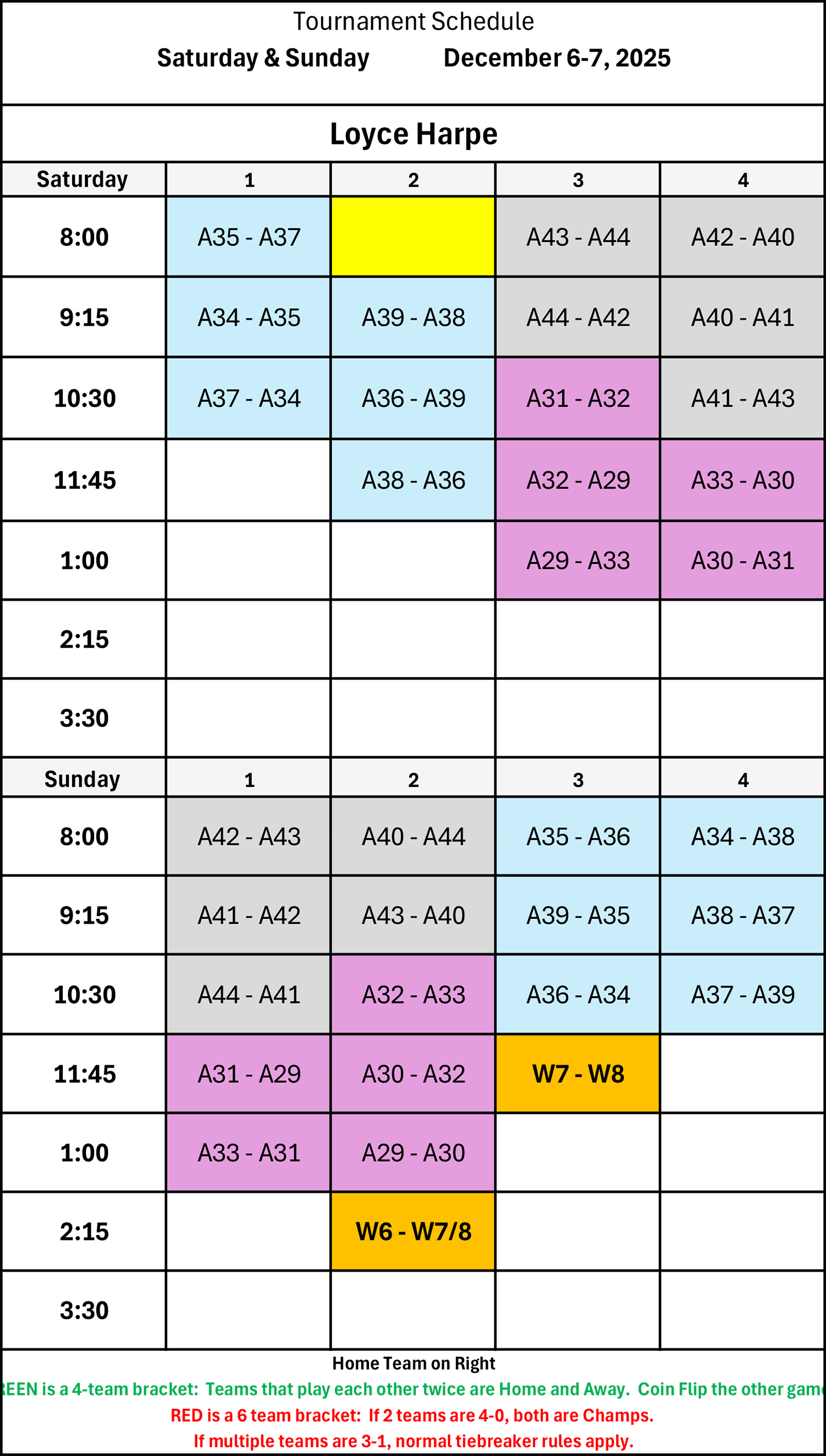 Home team on the right. | Brackets with 4 teams: teams that play each other twice are home & away. Coin flip the other games. | Brackets with 6 teams: if 2 teams are 4-0, both are champs. If multiple teams are 3-1, normal tiebreaker rules apply.